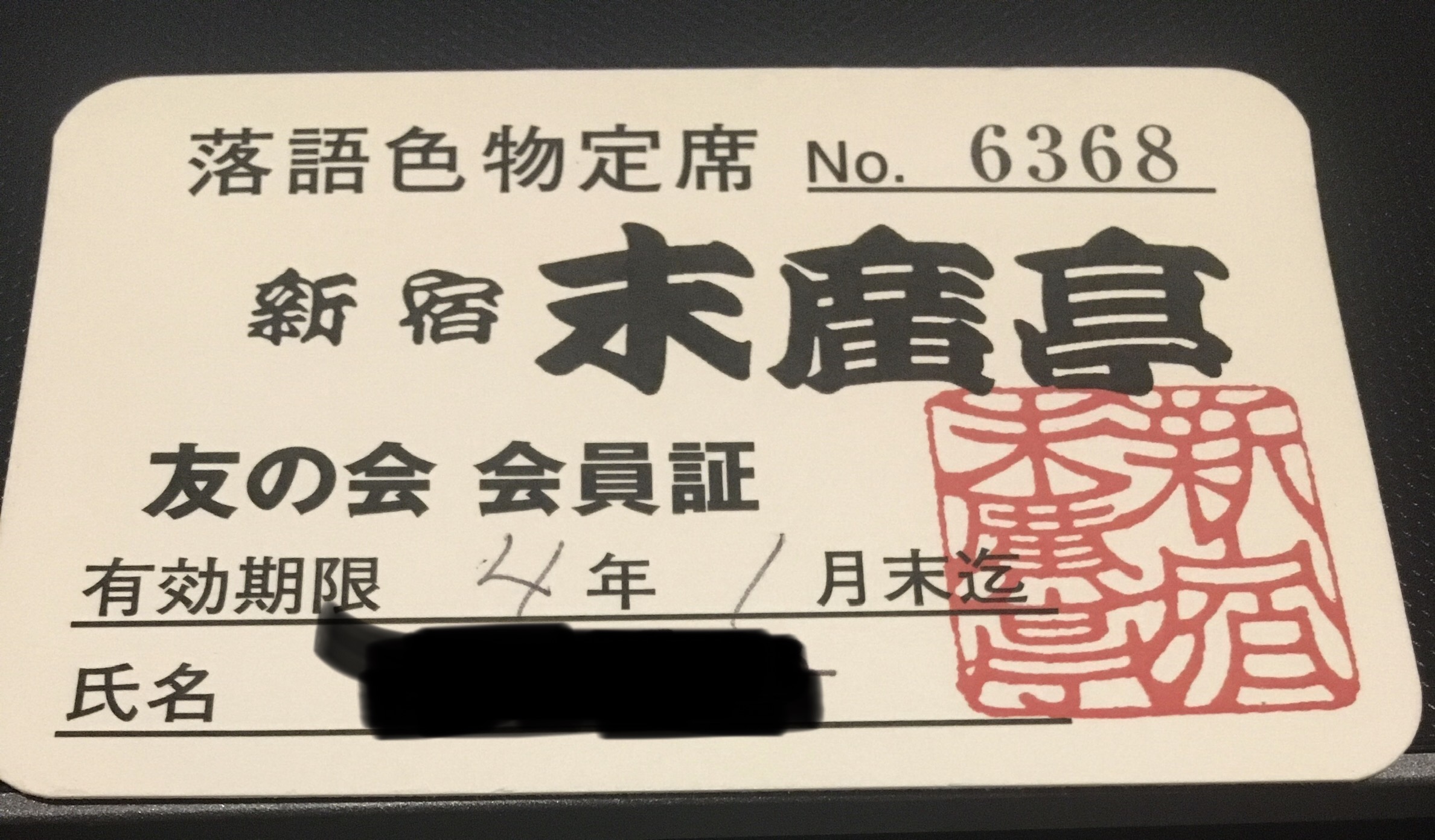 一万円で入場券4枚(3か月ごとに送られてくるらしい)と末広亭の湯呑と扇子(または手拭い)がついてきました。